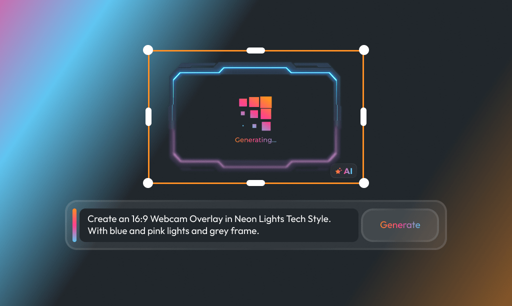 Generate personalized webcam frames with just a prompt. Our AI Webcam Frame Generator works seamlessly inside the Scene Builder, allowing you to create stunning frames that match your branding and elevate your on-stream visuals.