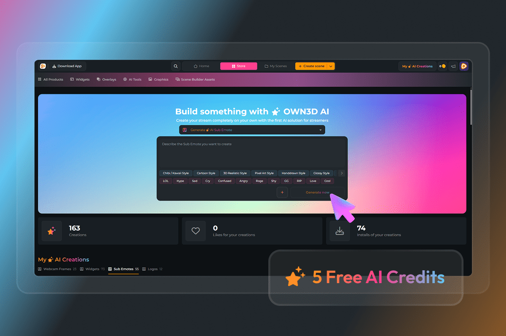 Every free user gets 5 AI credits to explore emotes, logos, widgets, or webcam frames. Need more? Upgrade to the Stream Pass for 50 monthly AI credits or the Widget Pass for 20 monthly AI credits. More ideas, more style, made with AI.