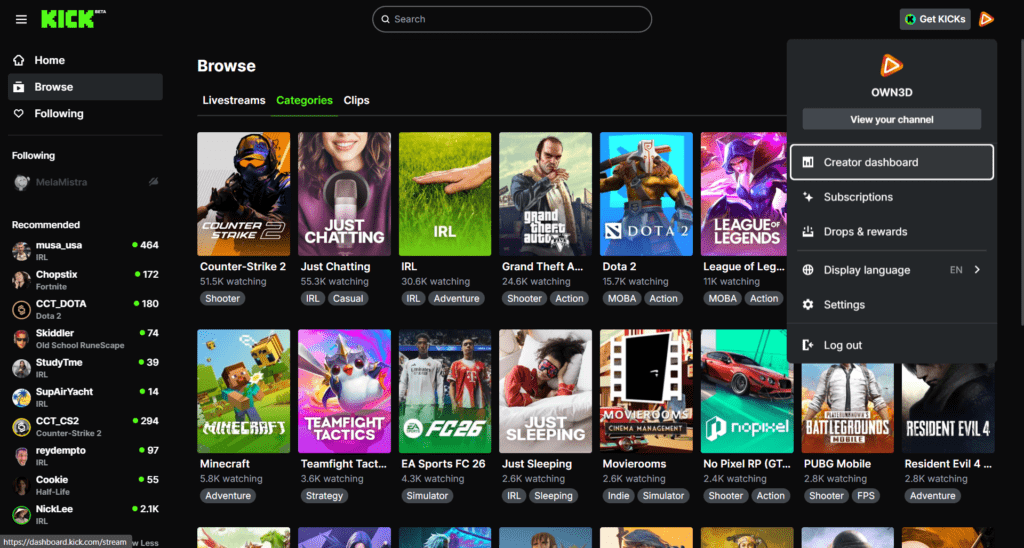 Click your Kick profile icon and open your Creator dashboard.