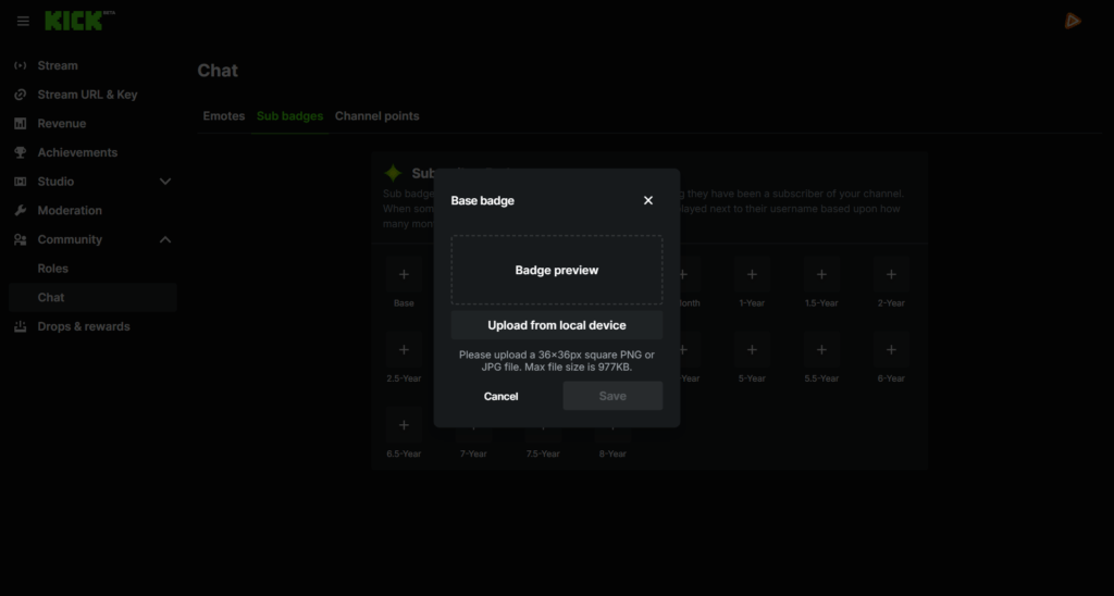 Upload each PNG file into the correct loyalty slot (1 month, 3 months, and so on) and select the required 36x36px size. Save your changes, and your Kick Sub Badges are live. From that moment on, every subscriber will proudly display their support next to their name in chat.