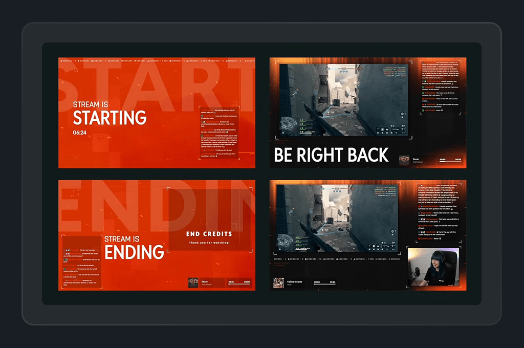 Keep your viewers in the loop with full-screen banners that guide them through your stream. Use “Starting Soon”, “Be Right Back”, or “Stream Ending” screens for a polished stream experience. These banners are an integral part of every YouTube streaming overlay, helping to build a consistent brand identity.