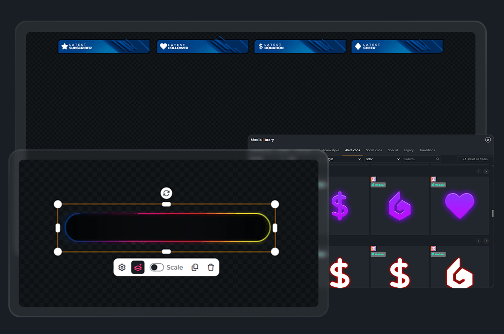 With the Scene Builder, you can easily create your YouTube stream overlay and see the results in real time. Add stream labels, banners for starting or breaks, webcam frames, and more. Each element can be positioned, customized, or hidden with just a few clicks.