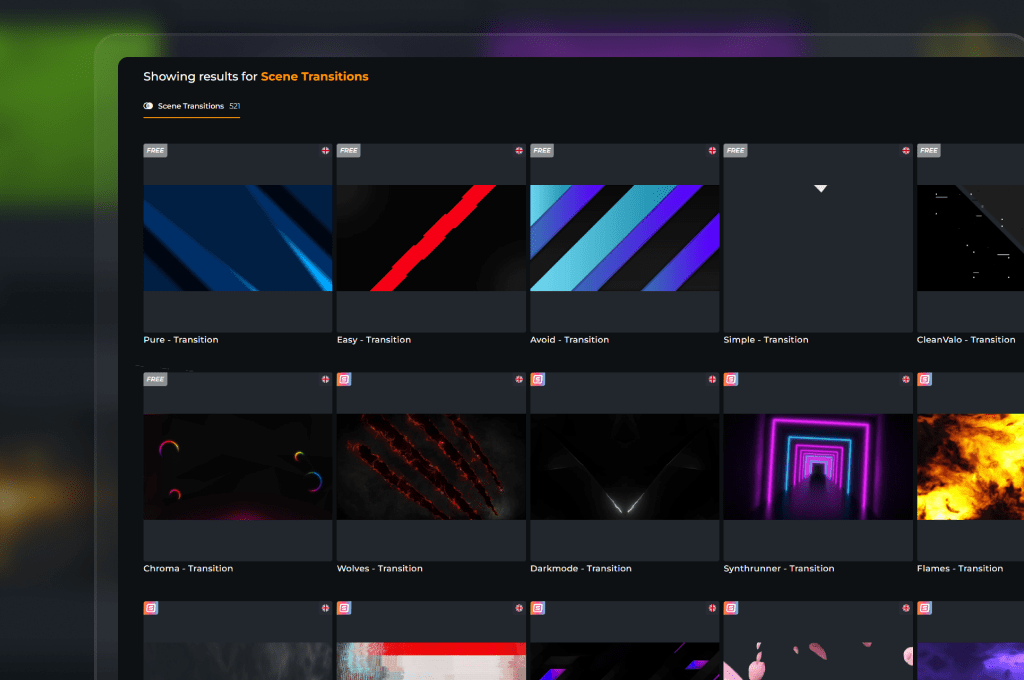 Scene transitions add a professional touch to your YouTube streaming overlay. Whether you’re switching between gameplay, chat, or ending scenes, smooth animated transitions keep your stream looking polished. With over 500 to choose from, even free stream overlays for YouTube look next-level.