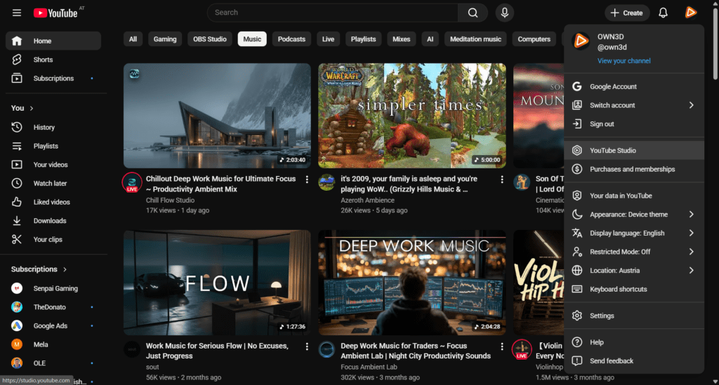 Inicia sesión en YouTube y haz clic en tu foto de perfil en la esquina superior derecha. Abre YouTube Studio y dirígete directamente a tu centro de control.