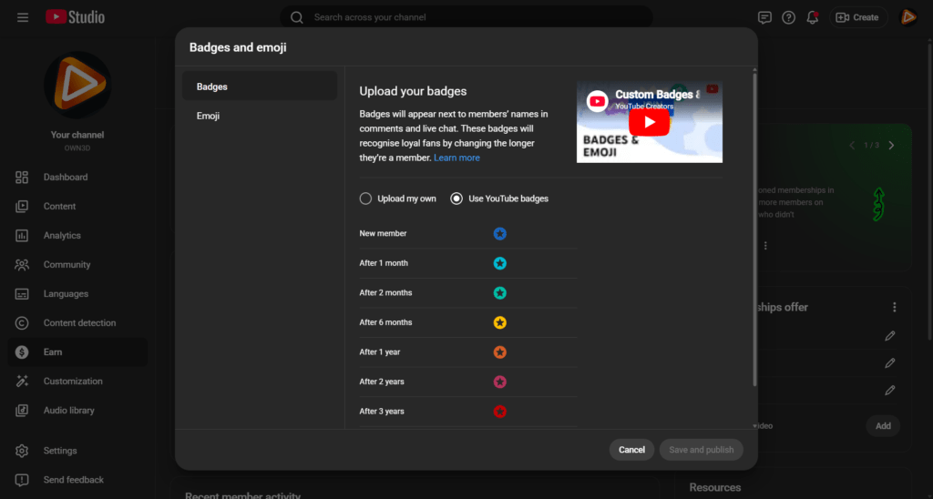 Las insignias de membresía de YouTube forman parte automáticamente de las membresías de tu canal. En YouTube Studio, ve a Ganar dinero → Membresías → Insignias y emojis y sube tus insignias de membresía de YouTube para cada hito de lealtad (1 mes, 2 meses, 6 meses, etc.).