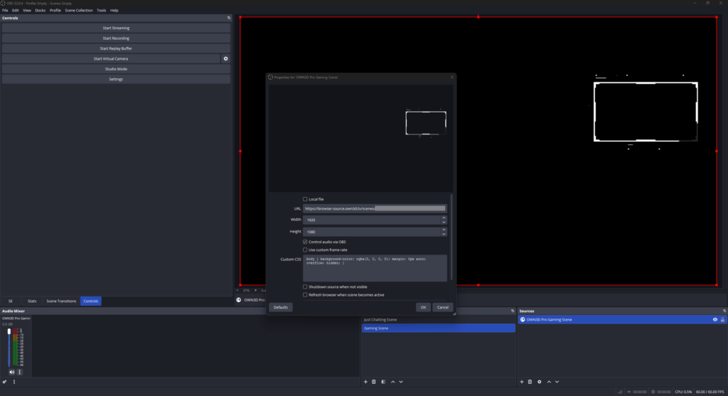 Ahora es el momento de añadir tu nueva escena con tu overlay de cámara a tu stream. Copia la URL de la fuente de navegador y abre tu herramienta de transmisión. Nosotros usamos OBS Studio.