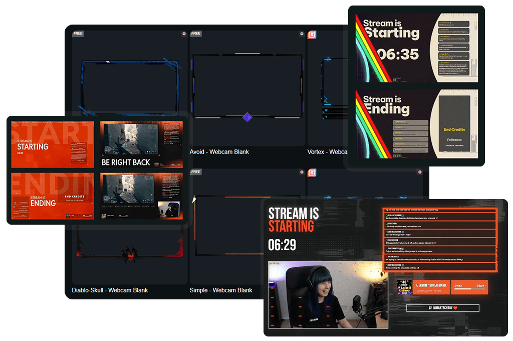 No necesitas una configuración cara para verte seguro en tu stream. Empieza con overlays de cámara gratuitos y consigue un estilo de overlay de webcam limpio en minutos. Cuando quieras ese toque extra, los diseños premium aportan más variedad, más movimiento y más personalidad, para que tu overlay de cámara se sienta aún más tuyo.