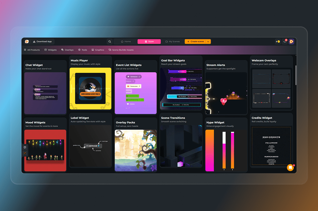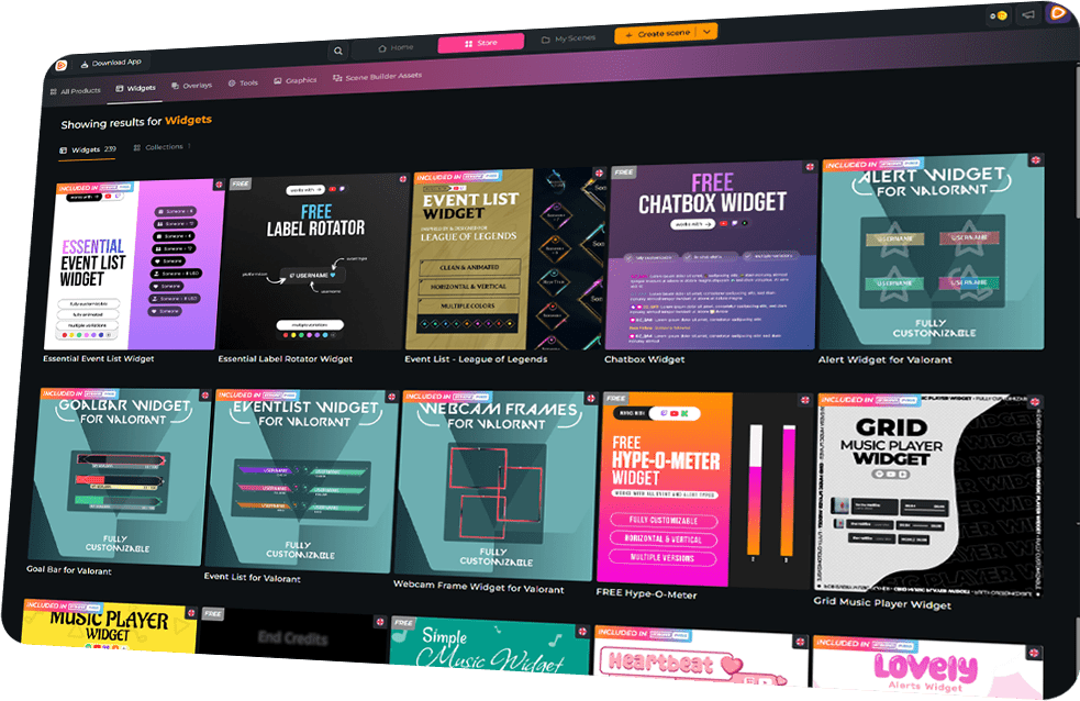 Escolha entre dezenas de ferramentas interativas, combine-as no Scene Builder e mantenha sua comunidade engajada — os widgets de stream do OWN3D Pro fazem seu stream se destacar.