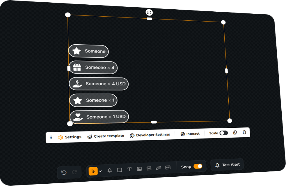Crie layouts exclusivos combinando Listas de Eventos com Alertas, unindo Barras de Goal com Chat ou adicionando um Reprodutor de Música à sua cena de contagem regressiva. Tudo é 100% personalizável, para que seus widgets sempre se encaixem na sua marca e design.